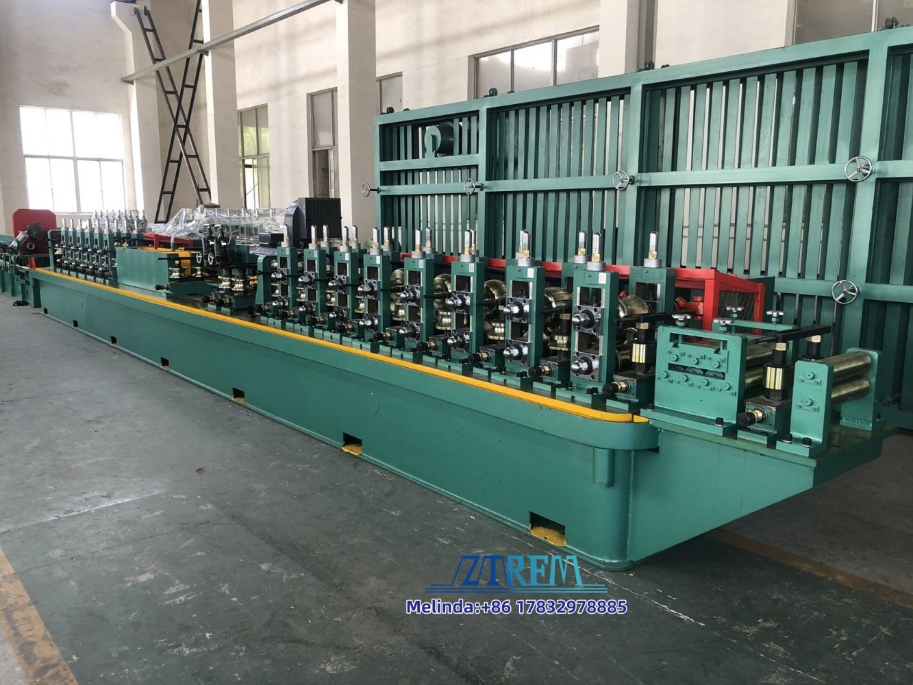 This is a high-frequency welding pipe-making machine; One machine can produce round steel pipes, square steel tubes, and rectangular steel tubes. Raw material could be a galvanized steel strip or a black steel strip. That is to say, this ERW steel pipe mill can produce black steel pipe and galvanized steel pipe.