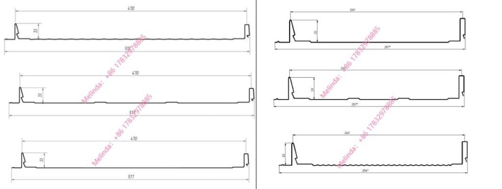 This is an automatically adjustable width snap lock roofing machine, one machine produces multiple sizes, with different ribs. Below are the profile drawings: